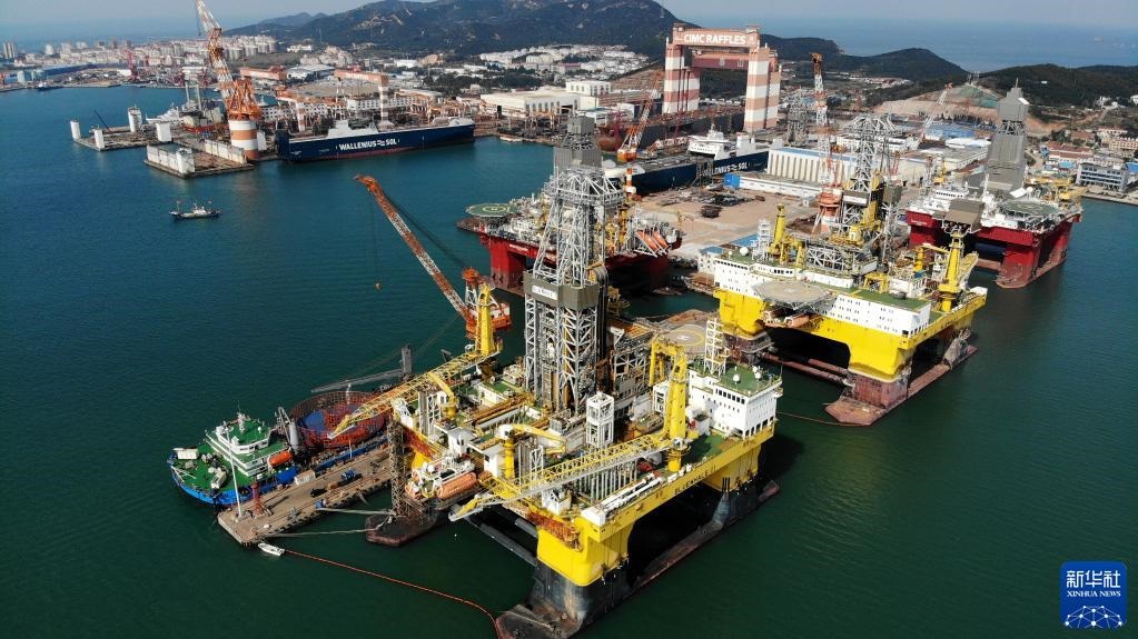 “藍(lán)鯨1號(hào)”(前右)及姊妹平臺(tái)“藍(lán)鯨2號(hào)”(前左)在其生產(chǎn)基地中集來(lái)福士海洋工程有限公司煙臺(tái)基地進(jìn)行維護(hù)和保養(yǎng)(2021年10月18日攝,無(wú)人機(jī)照片)。新華社記者李紫恒攝