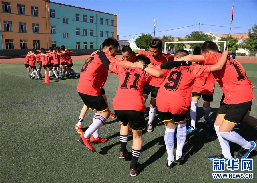 6月15日,內(nèi)蒙古自治區(qū)呼和浩特市托克托縣第二小學(xué)學(xué)生在訓(xùn)練間隙進(jìn)行趣味活動(dòng)“圈羊回家”。新華網(wǎng)發(fā)(馬斌攝) 托克托縣第二小學(xué)是國家級(jí)校園足球特色學(xué)校,學(xué)校已在4—6年級(jí)開設(shè)了足球課。 -