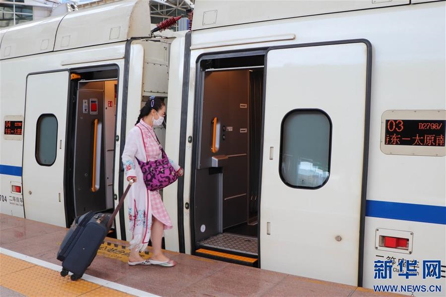 7月1日,在呼和浩特東火車站,鐵路工作人員在D2798次“和諧號(hào)”動(dòng)車組列車旁合影留念。 自7月1日起,內(nèi)蒙古呼和浩特與山西太原間首次開(kāi)行動(dòng)車組列車,動(dòng)車組列車每日開(kāi)行2對(duì),兩地間客運(yùn)鐵路運(yùn)行時(shí)間由過(guò)去的近10小時(shí)縮短至最快5小時(shí)以內(nèi)。 新華社記者 朱文哲 攝